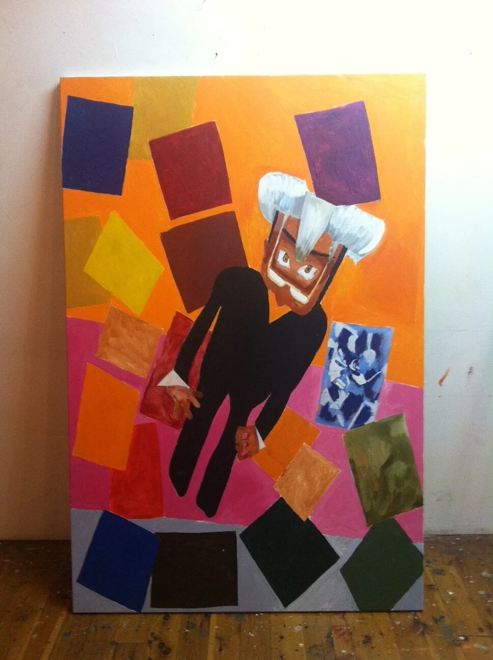 I painted Sue Cato last year twice. The first, sees Sue Cato in her life, what I perceived to be her life, surrounded by people, ideas, home renovation and her dogs and cats, larger than life as a painting, but setting her contained within it, modestly, scaled, settled, happy.
